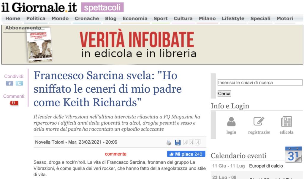Per fare tutto ciò, basta andare a leggere l’articolo originale pubblicato sul sito de Il Fatto Quotidiano nella giornata di ieri. Nel quarto paragrafo (annunciato con un titoletto in grassetto, anch’esso molto acchiappa-attenzione) Sarcina parla del rapporto con il padre, dell’ictus che lo aveva colpito e della sua morte: «Poi non ce l’ha fatta più. Ho disperso le sue ceneri in mare. Ricordo perfettamente quel giorno. D’un tratto mentre stavo spargendo le ceneri è cambiato il vento, mi è finito tutto in faccia. Mi bruciavano le narici, gli occhi, avevo sniffato le ceneri di mio padre come è successo a Keith Richards dei Rolling Stones». Una frase, quest’ultima, ripresa da molti blog e siti di Gossip, ma anche da quotidiani nelle loro edizioni online.