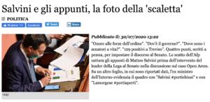 La foto della scaletta Salvini è stata immortalata dall’agenzia Afp e pubblicata sul sito dell’AdnKronos. Nell’immagine si vedono i fogli con gli appunti presi a penna dal leader della Lega. Da lì si possono leggere i punti cardine su cui l’ex ministro dell’interno voleva insistere e ha poi insistito nei suoi dieci minuti di dichiarazione a Palazzo Madama.