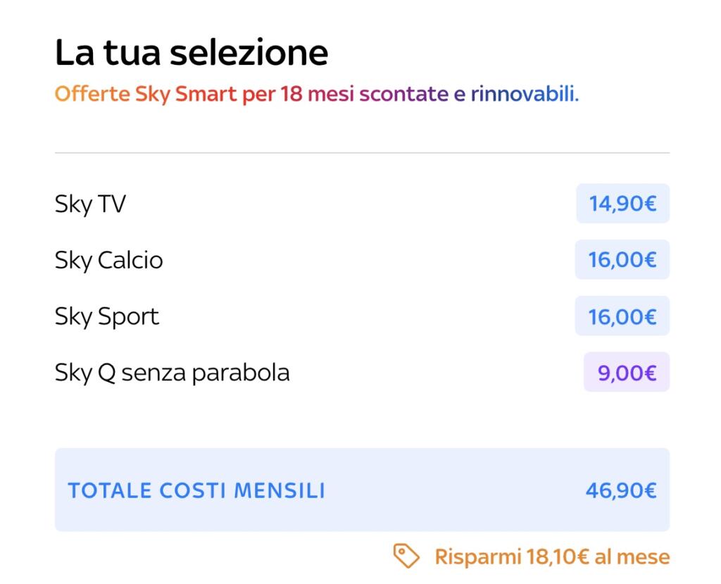 Partiamo da Sky. Per simulare il costo mensile di un abbonamento basta collegarsi sul sito ufficiale e accedere al configuratore.