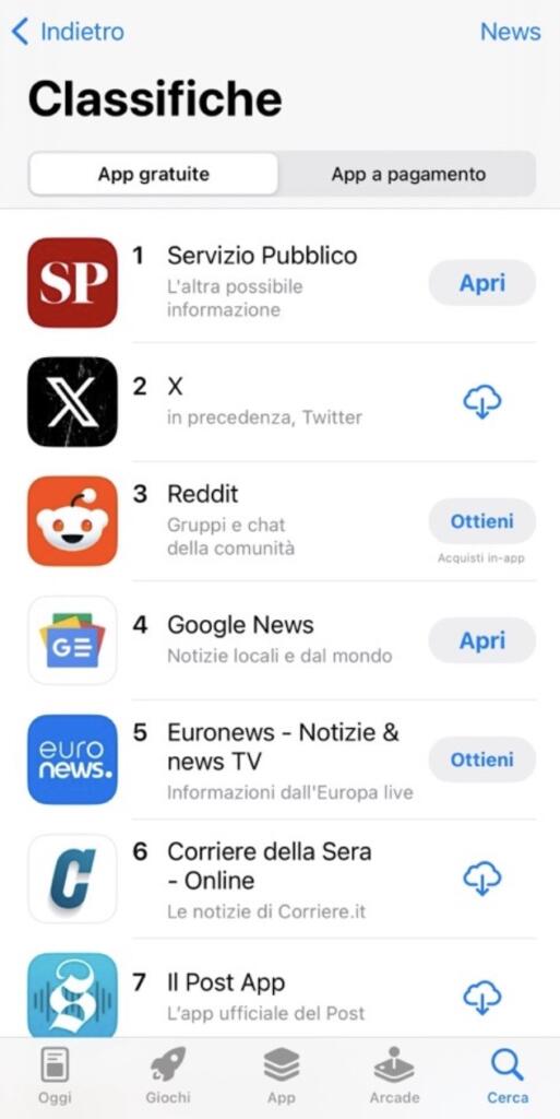 Davanti a X – che come abbiamo spiegato in passato, viene etichettata come app di news da parte dell’AppStore di Apple, così come Reddit -, ma anche davanti a Google News, Euronews, Corriere della Sera e Il Post. Dunque, è bastata un messaggio televisivo, una scritta sul videowall e un invito al download da parte di Giovanni Floris, per spingere le persone a scaricare l’applicazione ed entrare nel mondo dell’informazione digitale di Servizio Pubblico.