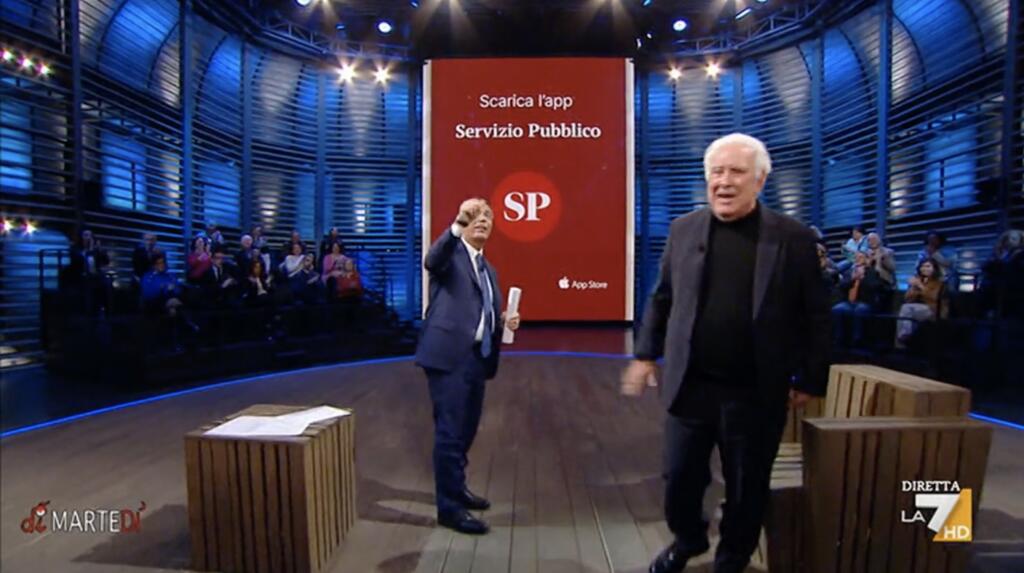 Martedì 9 gennaio è andata in onda la prima puntata del nuovo anno della trasmissione condotta da Giovanni Floris su La7: Di Martedì. Tra gli ospiti della trasmissione c’è stato anche Michele Santoro, intervistato sui vari temi legati all’attualità politica e sociale del nostro Paese (e non solo). Al termine dell’intervista, nelle fasi di saluto, sul videowall all’interno dello studio è stata mostrato il nome dell’app “Servizio Pubblico”, con l’invito – da parte di Floris – a scaricare l’applicazione attraverso gli store per iOS e Android.