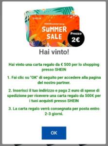 Su Facebook, invece, alcuni utenti segnalano come possibile truffa un’offerta, che come quelle presenti nelle Storie di Instagram sfrutta in nome di Shein, che riguarda però delle “carte regalo” dal valore di 500 euro da spendere per fare shopping su Shein. La carta viene spedita a domicilio, si legge in alcuni screenshot pubblicati dagli utenti, pagando 2 euro per sostenere le spese di spedizione. Si tratta di offerte sospette che gli utenti ricevono principalmente via e-mail. Un altro utente dice di aver ricevuto una e-mail da un indirizzo che sembra quello di Shein in cui gli viene comunicato di essere «uno dei finalisti del concorso con in palio 200 euro di prodotti Shein». Nella e-mail compaiono, per esteso, i nomi delle tre persone selezionate apparentemente da Shein. Nel post pubblicato su Facebook, l’utente scrive di non aver «mai avuto a che fare con Shein».