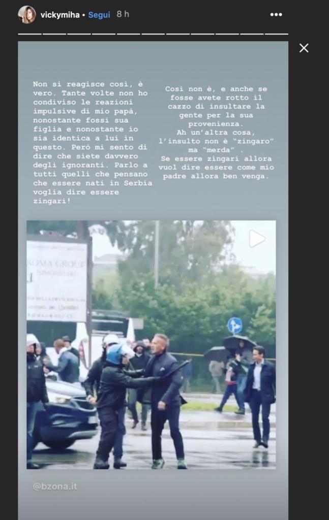 A confermare che si trattava non di un tifoso ma di un agente sono stati anche i familiari di Sinisa Mihajlovic. In primis la moglie Arianna Rapaccioni che sui social ha scritto «probabilmente si tratta di un rappresentante delle forze dell’ordine». Anche la figlia Viktorija ha condiviso le immagini del diverbio diventate virali in una storia Instagram. «Non si reagisce così, è vero» ha scritto la giovane nella storia «tante volte non ho condiviso le reazioni impulsive di mio papà, nonostante fossi sua figlia e nonostante io sia identica a lui in questo. Però mi sento di dire che siete davvero degli ignoranti. Parlo a tutti quelli che pensano che essere nati in Serbia voglia dire essere zingari! Così non è. E anche se fosse avete rotto il c***o a insultare la gente per la sua provenienza. Ah, un’altra cosa. L’insulto non è “zingaro”, ma “merda”. Se essere zingari vuol dire essere come mio padre allora ben venga».
