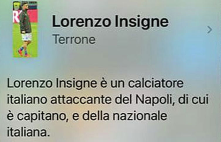 Oggi la situazione sembra essere tornata alla normalità e chiedendo aiuto all’assistente vocale della Mela la prima risposta è la canonica pagina Wikipedia che riassume la carriera di Lorenzo Insigne. Ma nella giornata di lunedì 14 dicembre, le cose sono andate diversamente. E non di poco. Ecco qual è stata la replica a chi poneva la domanda: «Siri, chi è Lorenzo Insigne?».