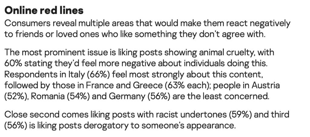 E gli italiani, in questo caso, sembrano i più sensibili. Ovviamente qui travalichiamo il concetto di lavoro ed entriamo in quello di percezione di un nostro contatto social. L’esempio utilizzato da Kaspersky è quello di like a contenuti che mostrano atti di crudeltà nei confronti degli animali. E nello Stivale tutto ciò è considerato molto grave, con il 60% degli intervistati che si è detto esser pronto a rivalutare – in negativo – l’idea di un “amico” social che esprime consenso nei confronti di tutto ciò. Senza scrivere nulla. Basta un like.