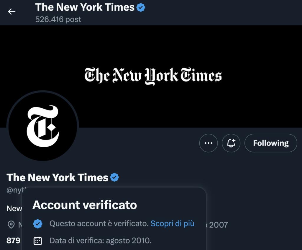 La prima testa a parlare di questa vicenda è stato il Washington Post che ha sottolineato come quel badge oro (che viene assegnato alle aziende e certifica la veridicità dell’account) sia sparito dal profilo ufficiale X del New York Times nella giornata di martedì e che sia stato sostituto dalla classica spunta blu.