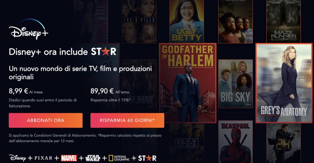 Il pagamento annuale (quindi in un’unica soluzione) fa risparmiare il costo di due mensilità: 89,90 euro ogni 12 mesi, anziché 107.88 euro (somma totale dei 8.99 euro al mese moltiplicato per i 12 mesi dell’anno). Dopo aver effettuato l’iscrizione (per chi non era già abbonato a Disney+) si può finalmente accedere nel mondo di Star.