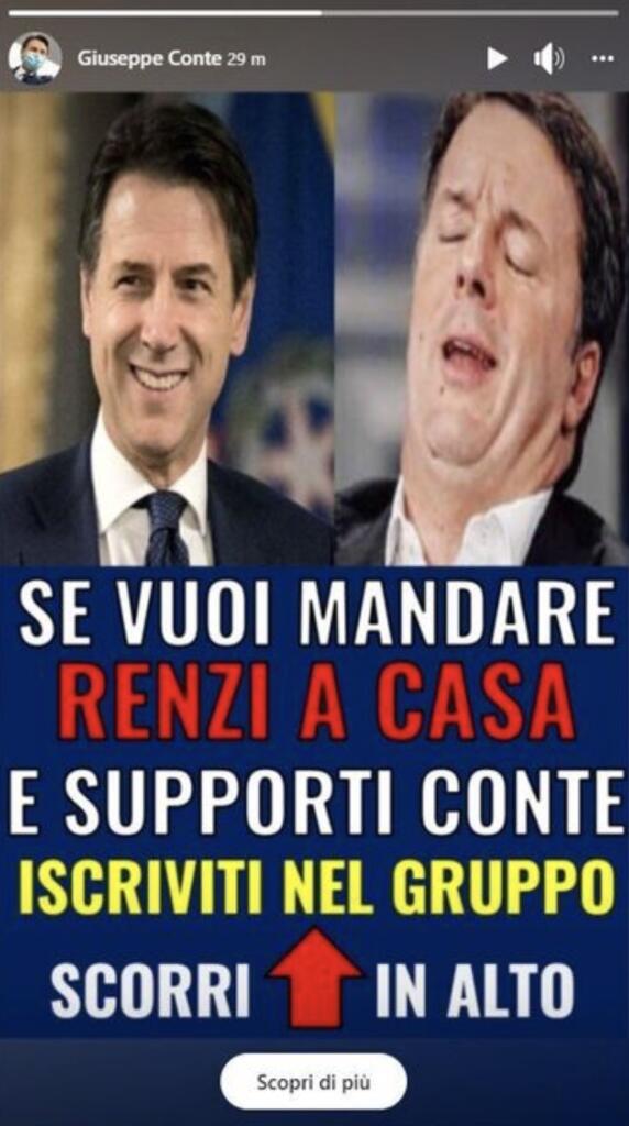 La certezza non c’è e difficilmente si saprà la verità. Pochi minuti prima delle 14 di oggi, giovedì 14 gennaio, è circolata la voce social di una storia Facebook di Giuseppe Conte contro Matteo Renzi. Dall’account-pagina ufficiale del Presidente del Consiglio sarebbe stata condivisa una foto – con tanto di swipe up – che rimandava a un gruppo Facebook (con evidenti simpatie pentastellate) che si chiama: «Conte Premier – Renzi e casa!». Utilizziamo tutti i condizionali d’obbligo visto che, per il momento, non è possibile risalire alla veridicità di quella condivisione.