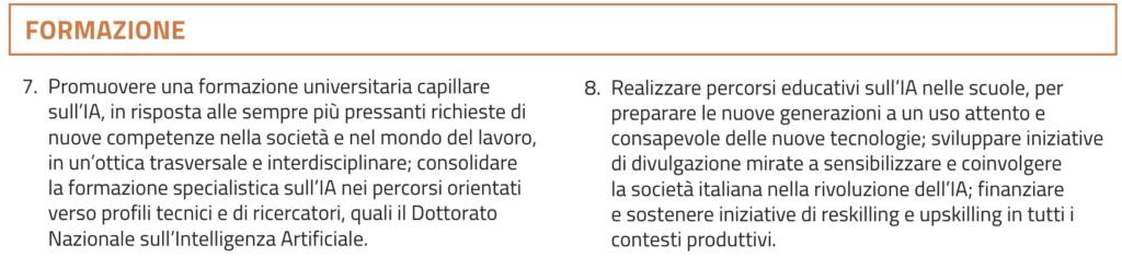 Per quel che riguarda la formazione dei giovani, si fa riferimento all’esigenza di insegnare nuove competenze legate anche all’intelligenza artificiali. Studi che non si basano solamente sul funzionamento tecnico, ma anche etico.