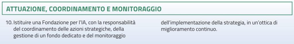 Infine, elemento che chiude i dieci punti della Strategia Nazionale AI, si parla del monitoraggio dello stato dell’arte attraverso una Fondazione.