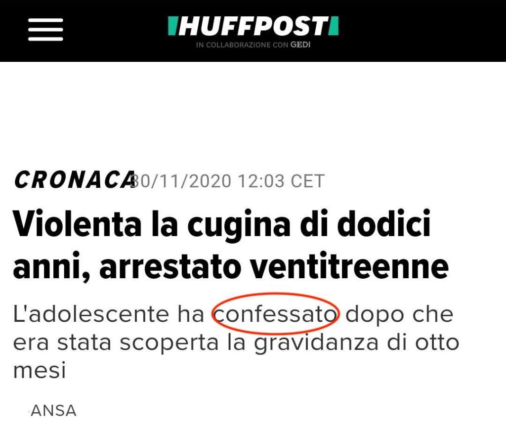 «L’adolescente ha confessato dopo che era stata scoperta la gravidanza di otto mesi». Ha confessato. Il termine confessare, però, non si può attribuire a una vittima, ma a un carnefice. E, in questo caso, non può essere riferito e attribuito a una 12enne vittima di stupro da parte del cugino. Lei, la giovane, può aver raccontato di aver subito una violenza sessuale. Di certo non deve confessare nulla.