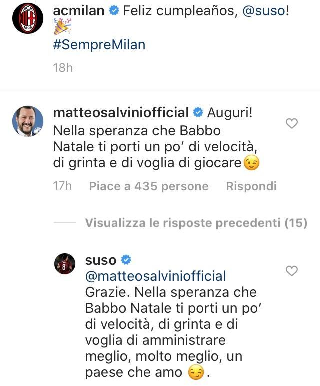Ripercorriamo le tappe della vicenda. Jesús Joaquín Fernández Sáenz de la Torre, più conosciuto come Suso, ha compiuto martedì 26 anni. Il Milan, come da tradizione, ha voluto dedicare al proprio tesserato il classico post di auguri con tanto di fotografia. Sotto l’immagine, tra i tanti commenti (dagli auguri alle perenni critiche al calciatore) compare anche quello che arriva dal profilo Instagram ufficiale di Matteo Salvini.