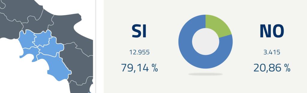 Scorrendo sulle 20 Regioni (ci sono i dati di tutte, tranne che della Valle d’Aosta), si può notare una netta divisione. Quasi una spaccatura. Alla fine il Sì ha vinto ovunque (cioè in ogni Regione), ma ci sono nette differenze. Abbiamo preso come esempio i due casi più estremi (non a livello geografico). Con quasi 8mila sezioni scrutinate, questa è la tendenza ufficiale del taglio dei parlamentari in Campania.