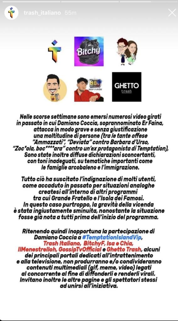A contribuire al successo dei programmi della televisione “trash”, un ruolo indiscusso è giocato dai canali social di intrattenimento. I commenti, le gif, i meme hanno portato molti utenti meno avvezzi alla televisione di intrattenimento ad interessarsi a reality Temptation Island, Grande Fratello, Uomini e Donne. Le gif di Malgioglio che dice «adoro» o di Valeria Marini in costume che chiede le cotolette sono diventate di uso comune, anche per chi tendenzialmente preferiva altri programmi da vedere di fronte allo schermo. Ecco perché la presa di posizione di canali social come Trash Italiano, Isa e Chia, BitchyF, il Menestrelloh, GossipTvOfficial e GhettoTrash avranno un enorme peso. Insieme hanno infatti manifestato grande «indignazione» per la partecipazione di Damiano Coccia, detto Er Faina. Il personaggio del web, che ha raggiunto la sua notorietà proprio grazie a dei “video denuncia”, ha spesso utilizzato terminologia e modalità estremamente aggressive e violenti: «Tra le tante offese – si legge nella comunicato social condiviso nelle storie instagram da TrashItaliano – “ammazzati” “deviata” a Barbara D’Urso, “zo**ola” e “boc******a” contro un’ex protagonista di Temptation». Per questo motivo i canali social di intrattenimento ritengono che la sua partecipazione sia inammissibile, e che il tentativo del programma di sminuire le polemiche sia inaccettabile, e hanno deciso di boicottarne la popolarità. Si legge infatti che non verranno prodotti né divulgati « contenuti multimediali (gif, meme, video) legati al concorrente al fine di diffonderli e renderli virali», invitando utenti e altre pagine social a fare lo stesso.