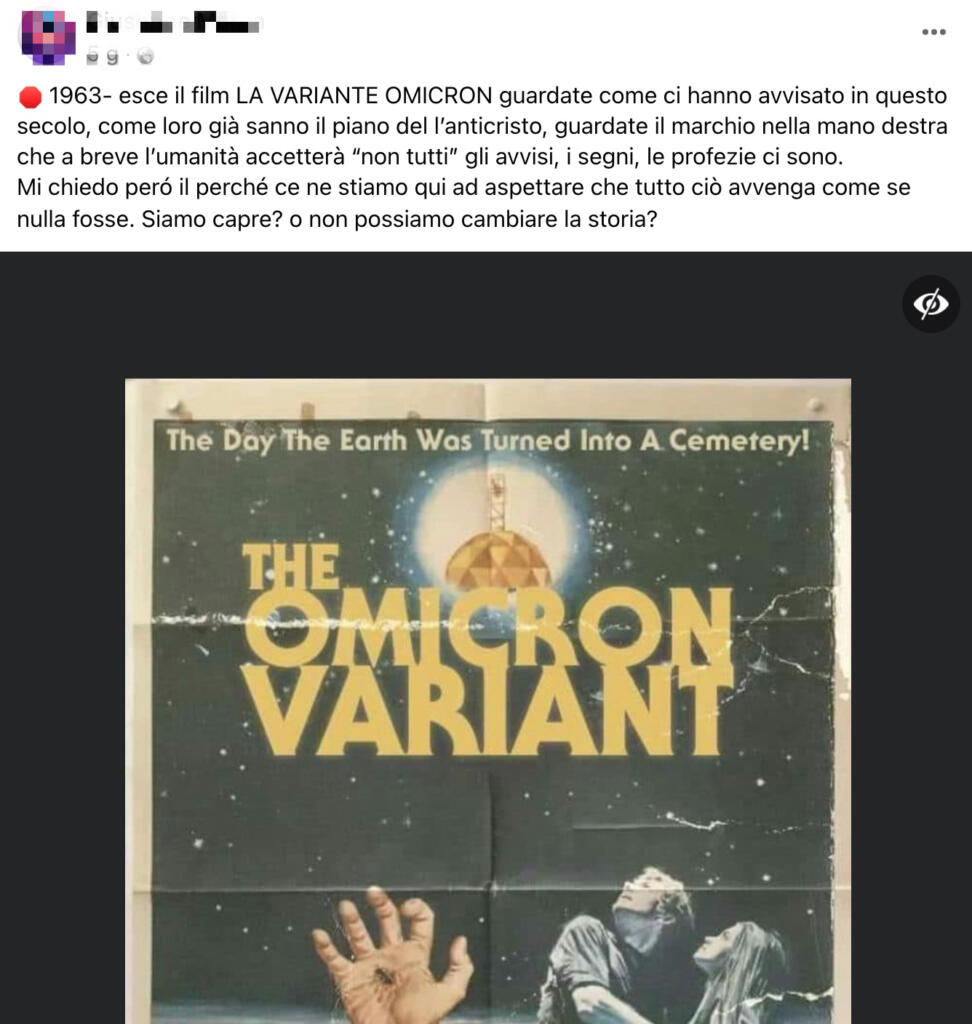 «1963 -esce il film LA VARIANTE OMICRON guardate come ci hanno avvisato in questo secolo, come loro già sanno il piano del l’anticristo, guardate il marchio nella mano destra che a breve l’umanità accetterà “non tutti” gli avvisi, i segni, le profezie ci sono. Mi chiedo però il perché ce ne stiamo qui ad aspettare che tutto ciò avvenga come se nulla fosse. Siamo capre? O non possiamo cambiare la storia?».