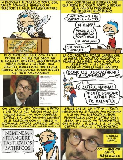 Il vignettista Natangelo ha scelto la via del fumetto per rispondere alla lettera fatta inviare da Danilo Toninelli. Una striscia che si conclude con un laconico: «Spiace che lei sia vittima di tanta derisione ma si faccia una domanda e si dia una risposta anziché prendersela con la satira che è libera ed è solo un termometro che misura il risibile. E lei sa dove certuni infilano il termometro. In bocca, che ha capito».