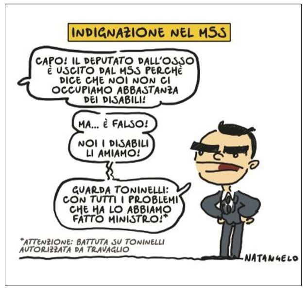 Nella vignetta – firmata Natangelo – comparsa su Il Fatto Quotidiano all’indomani di quella di Vauro bocciata da Marco Travaglio, il ministro delle Infrastrutture e dei Trasporti viene «descritto» come un disabile. «Capo, il deputato Dall’Osso è uscito dal M5S perché dice che noi non ci occupiamo abbastanza dei disabili. Ma è falso, noi i disabili li amiamo! Guarda Toninelli, con tutti i problemi che ha lo abbiamo fatto ministro». Questo è il testo della vignetta di Natangelo, con tanto di asterisco che rimanda a una nota: «Attenzione, battuta su Toninelli autorizzata da Travaglio».