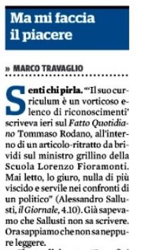 «‘Il suo curriculum è un vorticoso elenco di riconoscimenti’ scriveva ieri sul Fatto Quotidiano Tommado Rodano, all’interno di un articolo-ritratto da brividi sul ministro grillino della Scuola Lorenzo Fioramonti. Mai letto, lo giuro, nulla di più viscido e servile nei confronti di un politico’ (Alessandro Sallusti, Il Giornale, 4.10). Già sapevamo che Sallusti non sa scrivere. Ora sappiamo che non sa neppure leggere». Questo il contenuto in apertura del ‘Ma mi faccia il piacere’ in cui Marco Travaglio, ogni lunedì, commenta con vena sarcastica gli avvenimenti dell’ultima settimana.