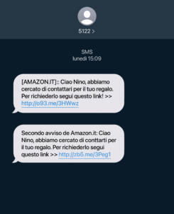 Un esempio di indebita assunzione dell’identità di Amazon tramite SMS: