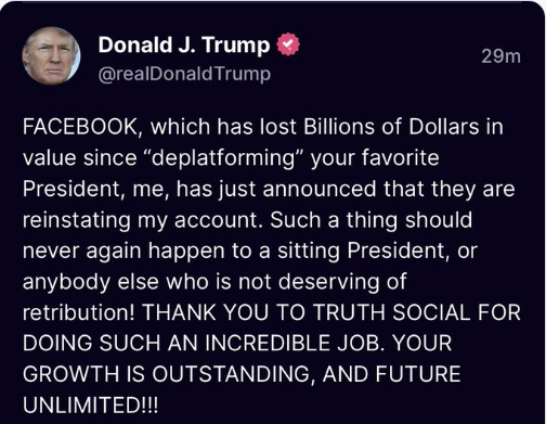 «Facebook, che ha perso miliardi di dollari di valore da quando ha ‘deplatformato’ il tuo presidente preferito, io, ha appena annunciato che stanno ripristinando il mio account. Questa cosa non dovrebbe accadere mai più a un Presidente in carica». E a nessun altro. Nonostante le folle incitate alla protesta.