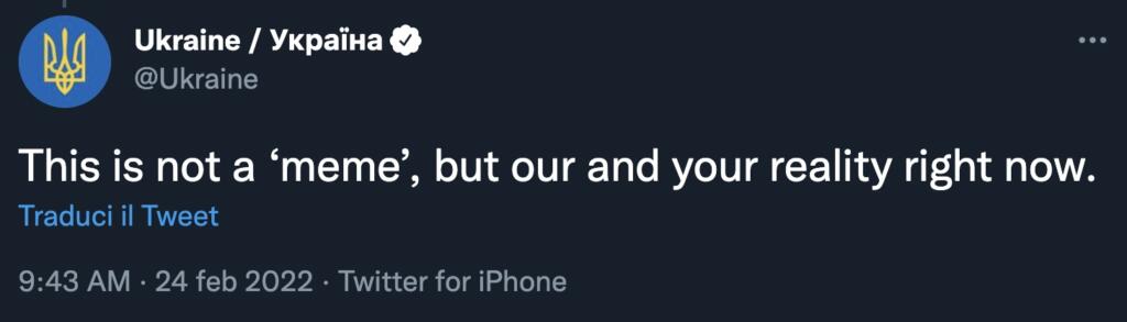 Mentre su Kiev e su molte altre città piovevano i primi missili, risuonavano le sirene anti-aeree e i carri armati russi entravano nel Paese facendo sponda sulla Bielorussia, le tensioni tra i due Paesi si snodavano anche attraverso i social network e i profili ufficiali. Nella giornata di ieri, mercoledì 23 febbraio, abbiamo parlato di quel post pubblicato (senza alcun commento) dal profilo dell’Ambasciata statunitense a Kiev e oggi la storia si è ripetuta, con soggetti diversi. Questo è il tweet del profilo ufficiale dell’Ucraina contro Vladimir Putin.