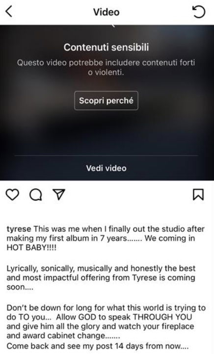 Instagram ha provveduto a etichettare quel video come “contenuto sensibile“. Questo vuol dire che l’utente/follower deve cliccare sul tasto “vedi video” inserito all’interno del disclaimer che annuncia la presenza di “immagini forti o violente”. Un primo passo che consente anche una soluzione conseguente: questa tipologia di contenuti non è visibile agli utenti non loggati, a coloro i quali non hanno specificato la loro età e chi risulta essere minorenne. Ma non è sufficiente. Perché se in Italia ci sono state innumerevoli strumentalizzazioni attorno a quel gesto, non è normale che un social network non agisca in modo più concreto rimuovendo quel contenuto. Perché quel filmato è diventato virale nei giorni scorsi e continua a essere anche oggi. Fino a travalicare i confini, fino ad arrivare a Los Angeles e sulla bacheca social di Tyrese Gibson. Senza tenere conto del rispetto per il dolore di quell’uomo.