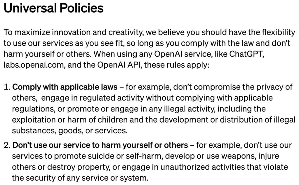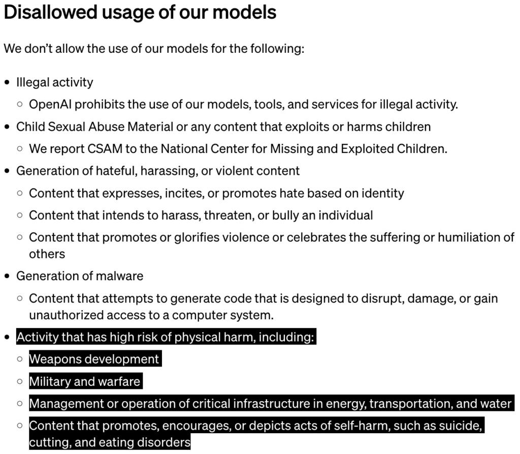 All’interno del capitolo dedicato all’utilizzo non consentito dei modelli sviluppati dall’azienda di San Francisco, c’è un esplicito riferimento all’inibizione di attività in grado di provocare danni fisici. Nello specifico, era scritto: