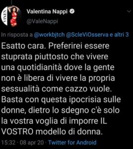 Negare che esistano contenuti video in cui le donne subiscono atti di violenza o che vengono condivisi senza consenso – a pochi giorni dall’eplosione dello scandalo del gruppo Telegram con scambio di materiale perdopornografico e revenge porn – ha dell’incredibile anche per un personaggio fuori dalle righe come Valentina Nappi. Ciò che il femminismo sostiene è che tutte le donne dovrebbero essere libere di esprimere se stesse e la propria sessualità come meglio credono, a prescindere dagli uomini e dai dettami imposti dalla società patriarcale e fallocentrica in cui viviamo. Se Valentina Nappi in questa definizione legge un «modello imposto di donna», una «ipocrisia sulle donne» o una limitazione delle libertà di queste ultime il problema è suo. Suo e di tutti coloro che, al suo lamentarsi per la cancellazione di un tweet che definisce lo stupro come scelta preferibile alla privazione della libertà sessuale, hanno dato ragione alla donna arrivando addirittura a ringraziarla.