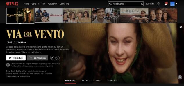 «Epopea della guerra civile americana girata nel 1939 – si legge nel disclaimer di Netflix su Via col Vento -, con un contestato approccio razzista. Per informarti sulla realtà dei neri cerca ‘Black lives matter’». Insomma, un po’ tutti hanno deciso di offrire note storiche prima di vedere questo film tanto discusso.