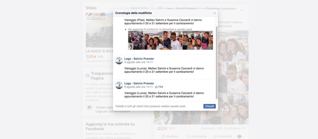 Come detto, ora sui profili social della Lega Salvini Premier appare la versione corretta del post, con Pisa ‘restituita’ alla Provincia di Lucca e non più a Pisa. Ma andando a visualizzare la cronologia delle modifiche, ecco comparire le modifiche. Alle 11.11 si parla di una Viareggio pisana; dopo tre ore esatte (con moltissime segnalazioni tra i commenti) arriva la modifica con la cittadina toscana che torna a essere una provincia di Lucca. Un altro errore geografico del Carroccio che si somma a una lunga collezione di gaffes.