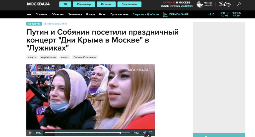 Questo screenshot immortale un frame del video pubblicato, esattamente un anno fa in occasione del concerto per “festeggiare” l’annessione della Crimea, dal portale Mosca 24 (qui il link alla versione archiviata). Quell’immagine, dunque, è la stessa mandata in onda anche lo scorso anno. Ovviamente non conosciamo i motivi per cui la televisione russa abbia utilizzato anche vecchie immagini da sovrapporre all’evento del 18 marzo del 2022. Sta di fatto che, però, il discorso di Putin non sembra essere manipolato. Qualche altra copertura, invece, probabilmente sì.