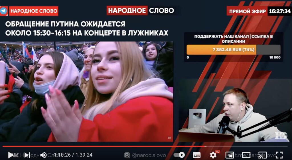 Innanzitutto si fa riferimento non al discorso di Putin, ma alle immagini del concerto. Perché è ormai tradizione quell’evento (anche) musicale per celebrare l’annessione alla Russia della Crimea. Ed è lì che su un programma trasmesso in streaming sul canale Youtube di Народное Слово compare questa immagine.
