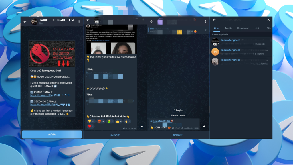 Ma questa dinamica, come spesso accade in queste situazioni, è riscontrabile anche su Telegram. Era successo già in passato, con altre vicende: la creazione di canali dedicati (o modificati ad hoc) in cui si annuncia la possibilità di poter visualizzare l’integrale del video morte Inquisitor in diretta su TikTok.