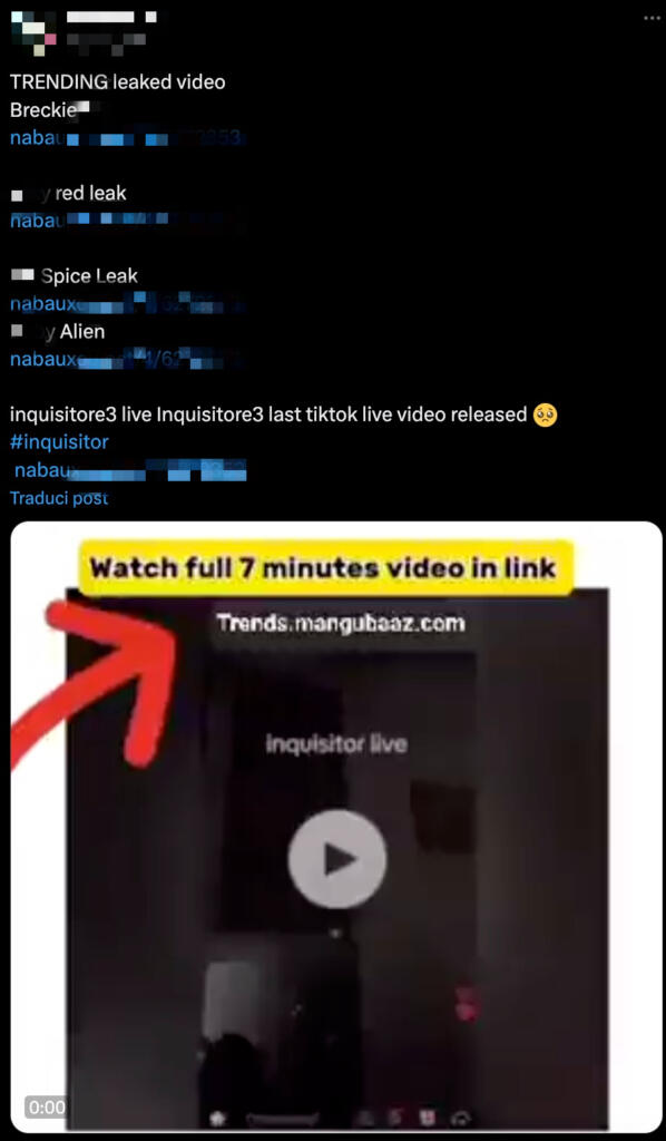 Non un solo post, ma migliaia. Utenti che hanno condiviso lo stesso identico messaggio, spammandolo e cercando di renderlo virale con uno stratagemma: auto-commentare per ingannare l’algoritmo attraverso un fittizio engagement. Infatti, prima che il clamore mediatico della notizia del suicidio del 23enne cosplayer di Bologna diventasse oggetto di approfondimenti giornalistici, tutti questi contenuti apparivano nella sezione “popolari” di X, cercando “Inquisitor”. Ovviamente, i link che abbiamo provveduto a oscurare sono fake e rimandano a contenuti di carattere pornografico.