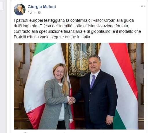 Toni riecheggiati da Giorgia Meloni, che sul suo profilo ha pubblicato anche una foto che la ritrae assime a Viktor Orban: «I patrioti europei festeggiano la conferma di Viktor Orban alla guida dell’Ungheria. Difesa dell’identità, lotta all’islamizzazione forzata, contrasto alla speculazione finanziaria e al globalismo: è il modello che Fratelli d’Italia vuole seguire anche in Italia».