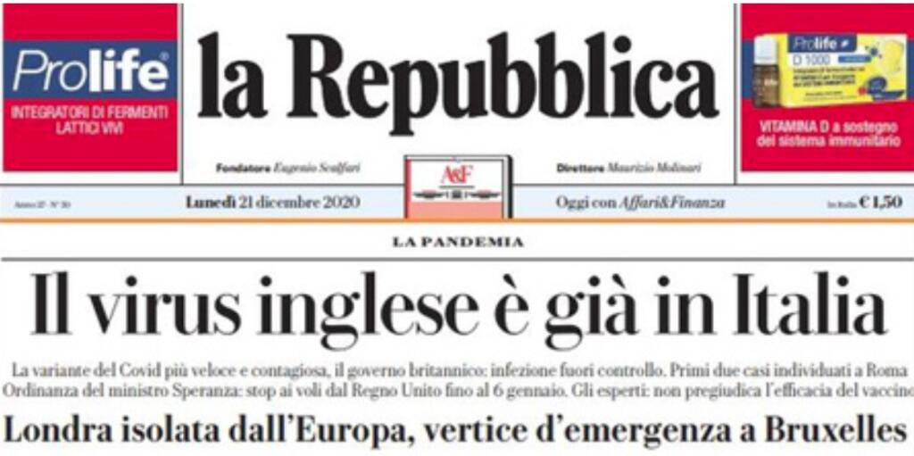 La sintesi giornalista (e titolistica) a volte genera veri e propri trending topic comunicativi che, però, si basano su fondamenta errate. Ed è il caso del «virus inglese» con cui si apre oggi, in taglio alto, la prima pagina del quotidiano La Repubblica. Una scelta che non ha trovato sponda sugli altri quotidiani che hanno deciso di trattare questo argomento nella propria prima pagina: da Il Corriere della Sera a La Stampa, passando per tutto il resto dell’edicola, ci si è fermati a una più sobria definizione di «variante inglese», visto che lì è stata individuata questa mutazione del Coronavirus che ha messo in allarme tutta l’Europa.