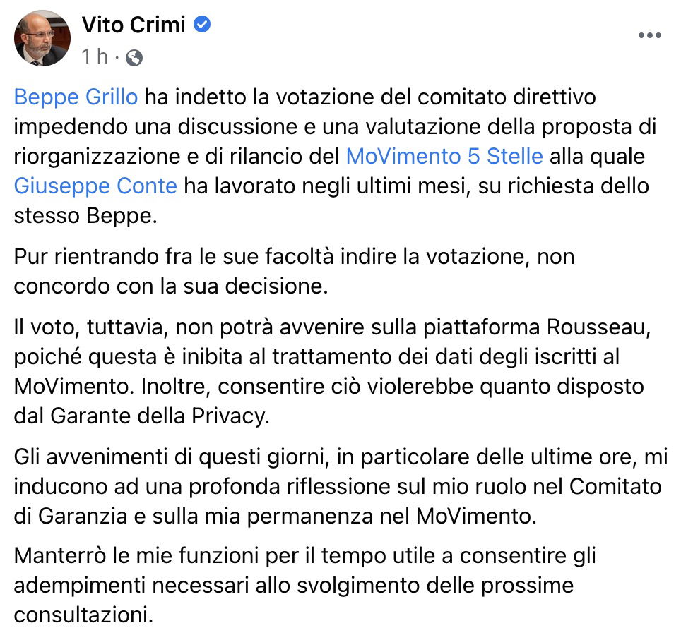 Le notizie, dunque, sono due. La prima è l’impossibilità nel procedere con una votazione su Rousseau perché violerebbe la disposizione del Garante della Privacy; la seconda riguarda la sua valutazione sul rimanere – o meno – a far parte del MoVimento 5 Stelle. E non solo in qualità di capo politico ad interim, e nemmeno in qualità di membro del Comitato di Garanzia. Insomma, potrebbe essere lui uno dei primi nomi a dire addio al M5S.