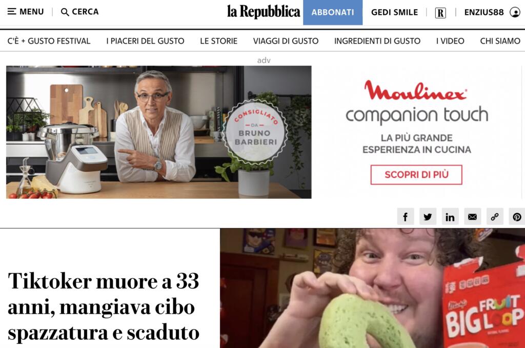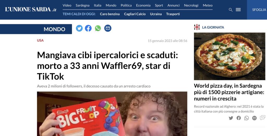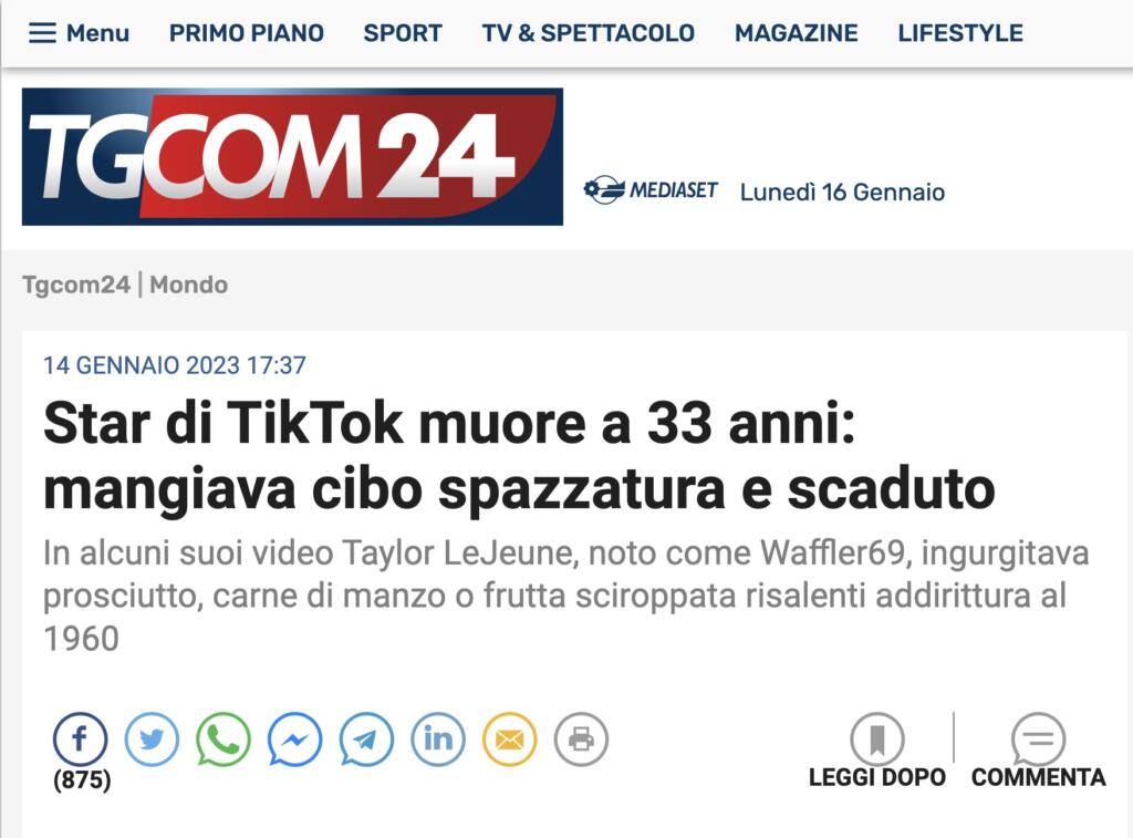 Ma come i giornali italiani hanno deciso di trattare la notizia di Waffler69 morto? Alcuni in modo corretto, limitandosi a riportare la notizia del decesso e a raccontare – perché è inevitabile, essendo un personaggio noto sui social ma non famosissimo nel resto dell’emisfero mediatico – perché LeJeune fosse così famoso. Altri, invece, hanno immediatamente attribuito questa morte alle sfide alimentari a cui il 33enne si prestava sui social. Ecco alcuni esempi.