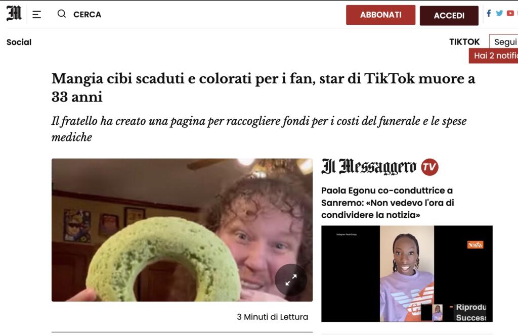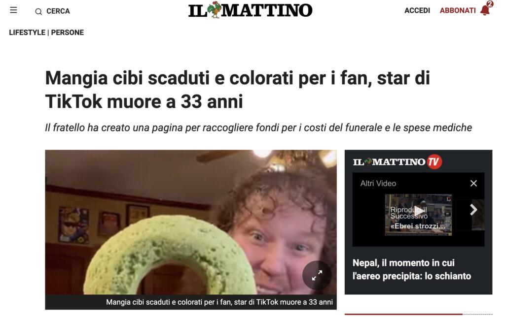 Il TikToker è deceduto a 33 anni per un presunto arresto cardiaco. Ma alcuni organi di stampa, senza aver contezza sulla veridicità di questa ricostruzione, hanno attribuito la morte al suo stile di vita alimentare (mostrato sui social)
