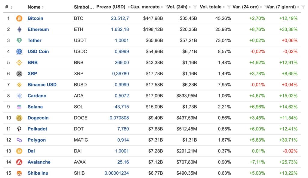 E questi sono solo i primi 15, tra cui troviamo i famosi Bitcoin (i primi a comparire sul mercato), poi Ethereum, Tether, Binance, Dogecoin e Shiba Inu. Solo una parte delle quasi 10mila criptovalute presenti sul mercato.