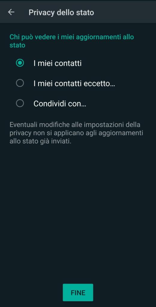 In questo caso, la privacy Whatsapp si sviluppa su tre livelli: la possibilità di rendere visibile l’aggiornamenti di stato ai contatti presenti in rubrica, ma anche selezionare a quale contatti non mostrarlo. Fino alla possibilità di condividerlo con qualcun altro.